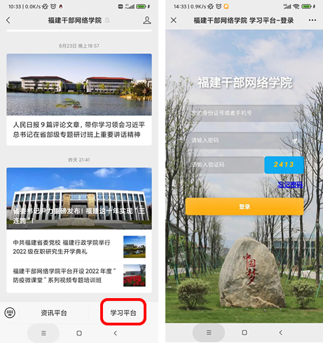 进入【福建干部网络学院】微信公众号,点击底部菜单“学习平台”,在弹出的登录界面输入用户名、密码等信息登录学习平台,若已绑定了微信号且登录过的,可在弹出的提醒框直接按“登录”进入。