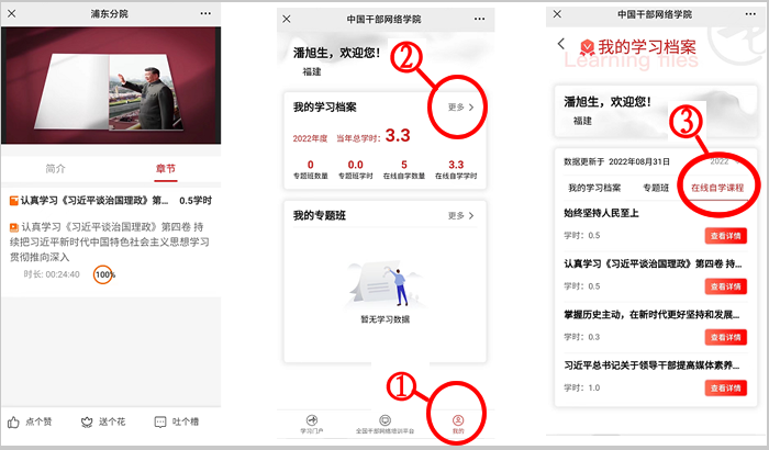 学习页面将提示进度,每个视频需100%完成后才计算学时(学完的课程因系统延迟,可能要一两天后才计入学时),可返回到首页,点击右下角“我的——我的学习档案——更多——在线自学课程”查看已完成课程情况。