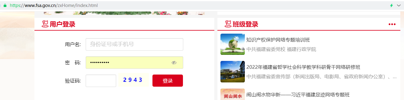 使用360安全浏览器,在地址栏输入网址http://www.fsa.gov.cn,在“极速模式”下(地址栏右侧为一个闪电的符号)打开,进入“福建干部网络学院”网。在页面左侧,用户登录处输入用户名(身份证号或手机号)、密码、验证码,单击登录(新用户初始密码为123456,登录后请按要求修改,已使用过该平台的用户若忘记登录密码,请点击“忘记密码”按钮进行验证修改)。