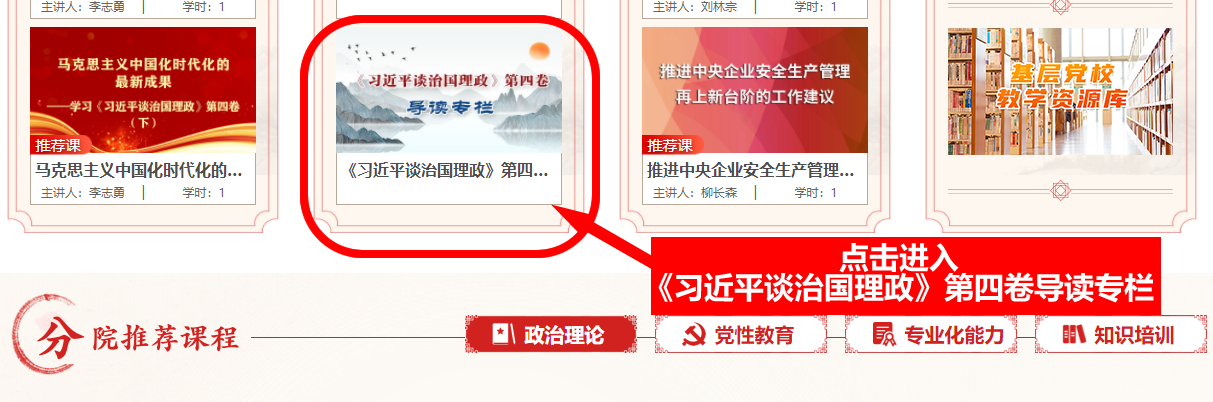 跳转到中国干部网络学院首页后,页面往下拉,找到以下红圈图标,点击进入《习近平谈治国理政》第四卷导读专栏。