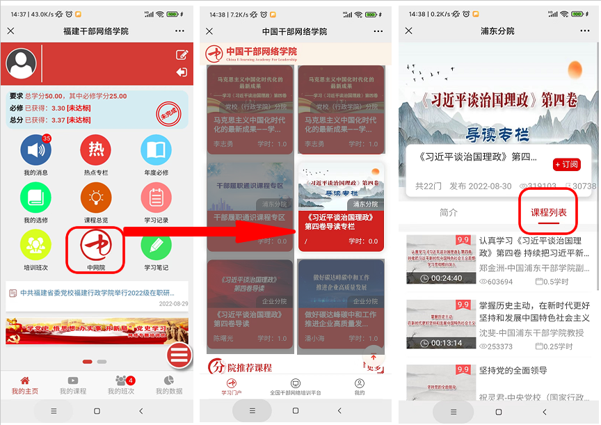 中网院”进入中国干部网络学院平台,往下查看并选择精品课程中的《习近平谈治国理政》第四卷导读专栏,进入后,点击“课程列表”,等待课程显示出来后,点击列表中的内容即可开始学习。