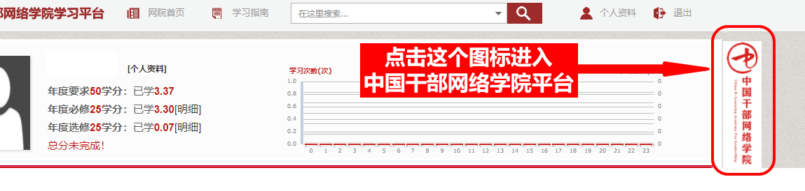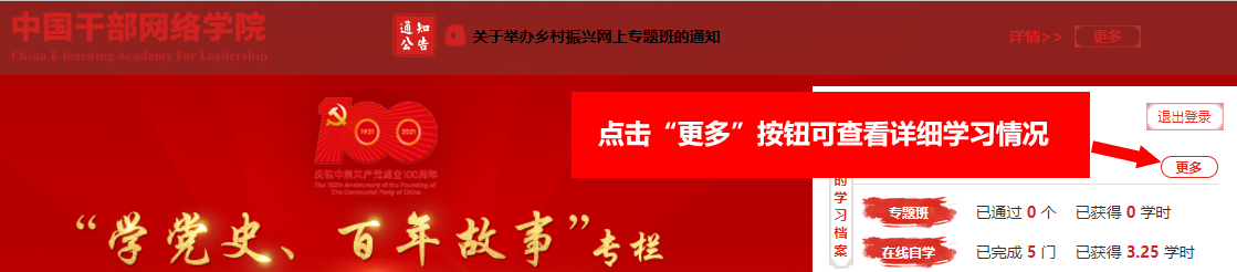 需查看学习情况,可返回中国干部网络学院首页,点击页面右上方“我的学习档案——更多”(注:由于全国处级干部都在学习,导致系统统计延迟,学完一个课程后不会马上显示学时,有时要等待一两天才能看到,但只要播放页面右边的进度显示100%,就表示已经完成了)。
